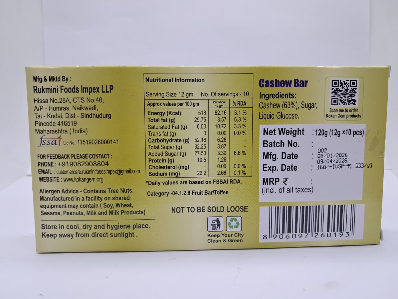 Healthy & Tasty Goodness: The cashew snack bar is a healthy snack fortified with the goodness of real ingredients. Scrumptious, nutritious and filling snack bars are a smart. No Artificial Add-Ons: No added colors or preservatives, just a whole lot of healthy and tasty goodness. Ready to eat snack bars. Open the Packet and Eat Storage Instructions: Keep in a cool, dry place away from direct sunlight and moisture This nutrition packed snack bar is ideal for when you want to keep it tasty and healthy.